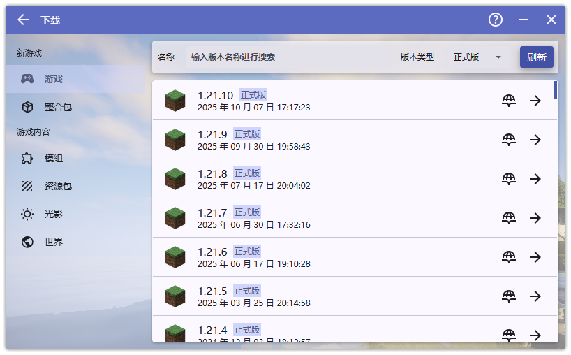 在下载页面,点击左侧顶部的「游戏」选项卡。这里会列出所有可用的游戏版本(版本号从上到下/由新到旧排序),选择一个你喜欢的版本。我们通常推荐最新的正式版。