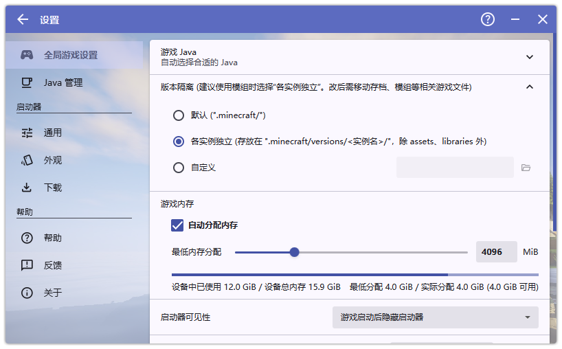 在全局游戏设置中找到 版本隔离 并设置为 各实例独立